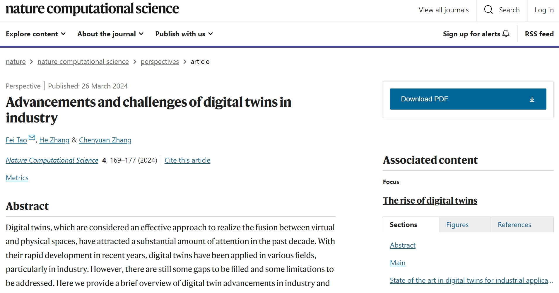 3月27日,陶飞教授团队受邀在《Nature Computational Science》杂志发表了工业领域数字孪生的综述与最新视角长文文章:《Advancements and challenges of digital twins in industry》。该文章对国内外数字孪生在工业领域的最新研究与应用进展进行了总结,深度剖析了数字孪生理论研究与工业实践过程中存在的问题及面临的挑战,并指明了未来发展方向。陶飞教授、张贺博士后、博士生张辰源为该文作者,陶飞教授为通讯作者,北京航空航天大学为第一单位。