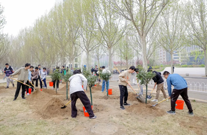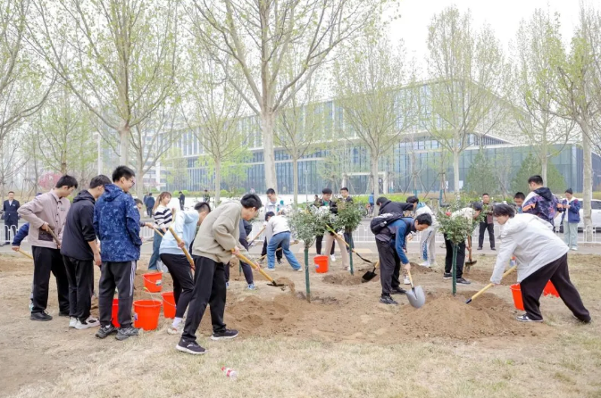植树现场,劳动场面繁忙有序,大家挖坑、立苗、填土、浇水,合力栽下30株优质树苗,包括红枫、红梅、高杆月季等树种,为沙河校园新添一片观赏区域。